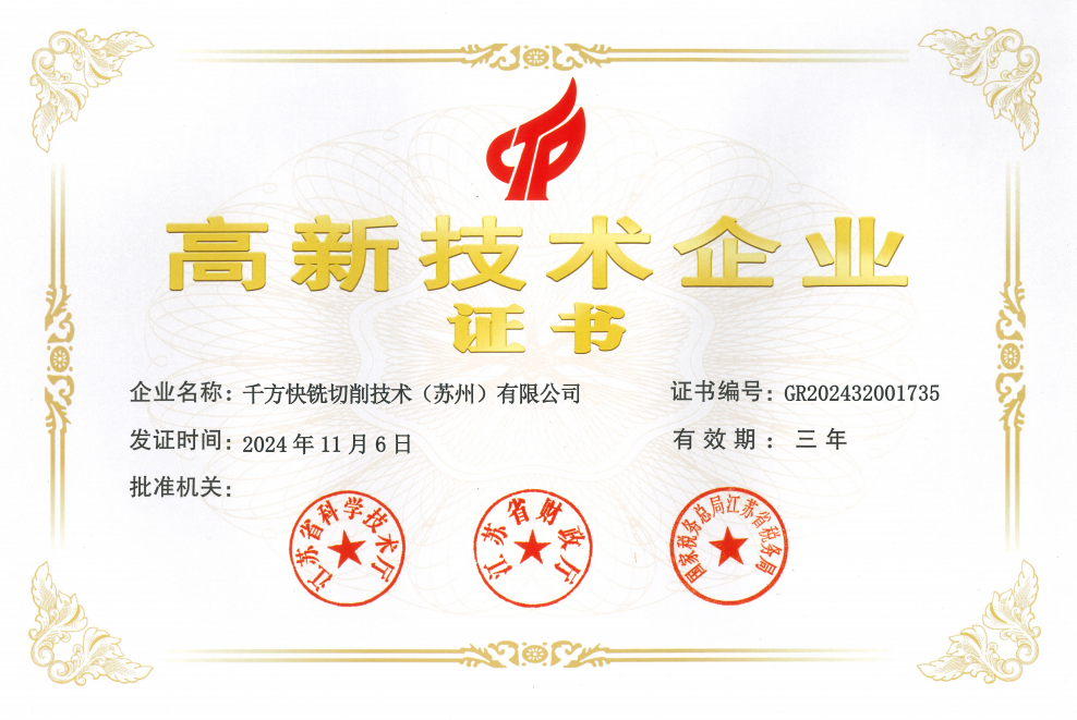 千方快铣切削技术(苏州)有限公司荣获2024年国家高新技术企业认定近日,千方快铣切削技术(苏州)有限公司凭借其在快速铣削技术领域的深入研究与卓越实践,成功荣获2024年国家高新技术企业认定,这标志着公